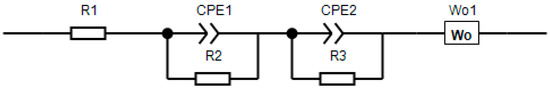 The impedance of the cathode materials obtained was investigated in a two-electrode cell, which was a CR2032 tablet layout, where lithium foil was used as an antielectrode. The impedance measurement was carried out on the Correct CS310 installation in the frequency range from 1.5 × 105 Hz to 0.01 Hz. The measurements were carried out in the infected state up to a potential of 4.3 V and the amplitude of the oscillations was 10 mV. The modeling of the impedance spectra was carried out using the ZView program. The impedance hodographs of the studied samples are presented in Figure 9. It is worth noting that usually when modeling impedance, an equivalent circuit is used, as shown in Figure 10. In this diagram, R1 is the resistance of the cell elements: the housing, spacers, and other components, R2 is the resistance of the CEI film (cathode electrolyte interface), and R3 is the charge transfer resistance. Each block of elements is characterized by a semicircle on the impedance hodograph.