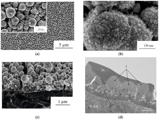 SEM images of the surface (a,b) and cross-section (c) of the sample with different magnifications and TEM image of the cross-section (d). 1—spherical globular particles; 2—Ge nanowires.