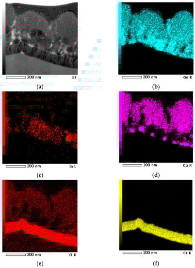 Figure 2 shows the BF-STEM (Bright Field Scanning Transmission Electron Microscopy, JEOL, Tokyo, Japan) image of the sample and EDX maps corresponding to Ge, Co, In, as well as O and Cr. The signal from Cr (Figure 2f) appears in the EDX map due to the presence of the Cr sublayer, which was deposited for enhancing the adhesion of the main deposit to titanium foil (see the Section 4.1).