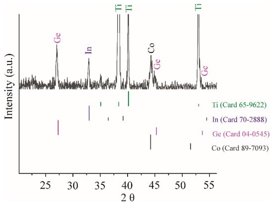 Figure 3 presents the results of X-ray phase analysis, which enables drawing more or less certain conclusions about the phase composition of the material under study. On the X-ray pattern, along with intense peaks of titanium, there are low-intensity peaks at ~27.1°, 32.9°, 44.3°, 45.1°. Peaks at 27.1° and 45.1° can be attributed to the cubic modification of Ge (Card 04-0545), and that at 32.9° to the tetragonal modification of indium (70-2888). The peak at approximately 44.3° most likely belongs to the cubic modification of Co (89-7093). This sample was marked as a Ge–Co–In nanostructure.