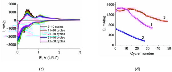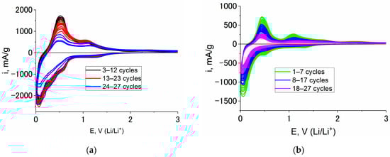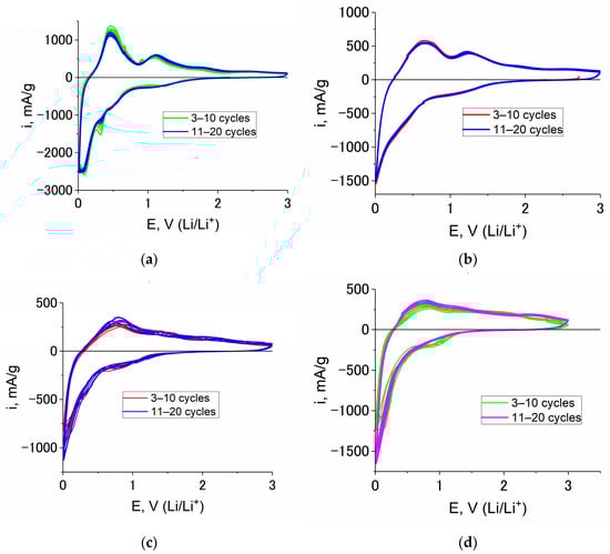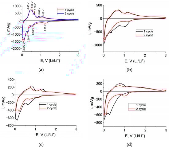 Cyclic voltammetry curves (the dependence of current on potential) of the test samples were recorded using a P-20X potentiostat (ELINS STC JSC, Moscow, Russia). The potential scan rates were 0.1 mV/s for the initial two cycles and 0.2 mV/s for the subsequent cycles.
