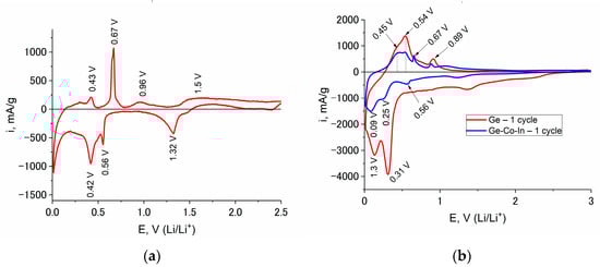 Comparison and analysis of the CV results (CVs at In, Ge and Ge–Co–In samples) suggest that the insertion of lithium into Ge–Co–In results in the formation of LixGe and LiyIn compounds (Figure 5b).
