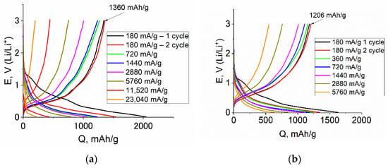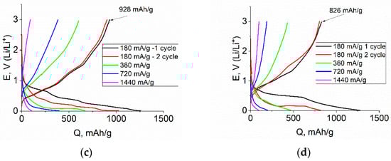 Chropotentiometry (galvanostatic method) was used to study the dependence of the working electrode potential on the transmitted charge. Galvanostatic charge–discharge curves were recorded using an AZRIVK-0.05A-5 V multichannel computer-aided cycler (JSC Buster, Moscow, Russia). The charge current corresponded to the cathodic polarization (lithium insertion) and the discharge current corresponded to the anode polarization (lithium extraction). In all cases, the charge current was equal to the discharge current. The charge was carried out to an end potential of 10 mV, and the discharge was carried out to a potential of 3000 mV. The current densities ranged from 180 to 23,040 mA/g. The specific current and specific capacitances were calculated relative the weight of Ge–Co–In. The current equal to 1440 mA/g corresponded to a 1 C rate.