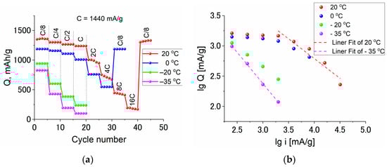 The variations in the discharge capacity Q of Ge–Co–In during cycling with different current densities i at temperatures of 20, 0, −20 and −35 °C are shown in Figure 9. Figure 8a presents the initial data of discharge capacity, Figure 9b presents Q, i dependences in bi-logarithmic coordinates to determine the applicability of the Peuckert equation.