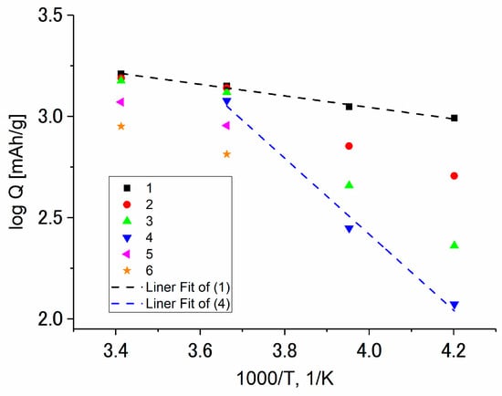 Figure 10 shows the temperature dependence of discharge capacity registered at various current densities. Here, this dependence is expressed in Arrhenius-kind coordinates, “logarithm of capacity vs. reciprocal absolute temperature”, which reflects the activation nature of the insertion process.