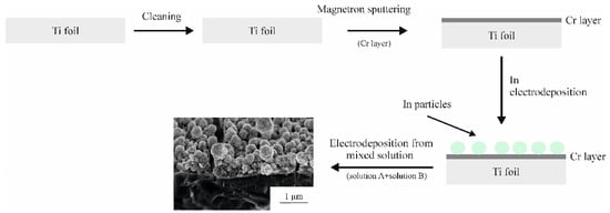 A 50 µm thick Ti foil was used as the current collector substrate. The foil was pre-cleaned in H2O-H2O2-NH4OH solution (4:1:1) at a temperature of 80 °C for 15 min followed by washing in hot deionized water and drying in an air stream. A chromium layer of approximately 80 nm thickness was used to provide adhesion of the formed layer to the substrate. This layer was deposited by magnetron sputtering. The foil was cut into 2 × 3 cm pieces. Arrays of indium particles were formed using the electrochemical deposition method. Electrochemical deposition of indium was carried out in a two-electrode cell. The working electrode was a titanium-chrome (Ti-Cr) substrate with a chemically resistant varnish around the working area. A platinum plate was used as a counter electrode. The solution consisted of 0.015 M citric acid and 0.01 M indium chloride InCl3. Deposition was performed at room temperature in the galvanostatic mode at 2 mA/cm2 for 5 min. Deposition was performed at a solution temperature of 20 °C (maintained by a Termex VT-01 thermostat). The current density was set using an Autolab PGSTAT302N galvanostat/potentiostat. Currents are normalized to the geometric surface area of the electrode.
