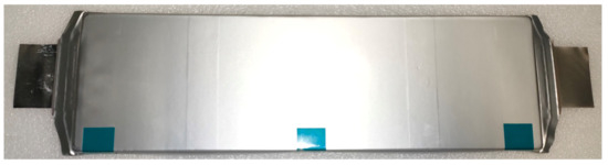 Cell under investigation. The pouch cell has large cell tabs on the sides, with which it can be electrically connected when testing modules. It can be seen that .