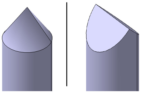 Schematic view of the two nail tip shapes used, depending on the direction of nail penetration. On the (left), a conical nail tip is shown and on the (right), a wedge shaped tip.