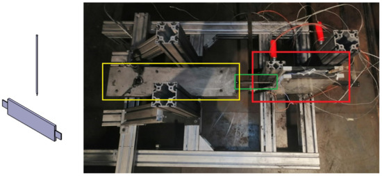 TR testbench for test case of “Nail penetration parallel to electrode layer”. (Left): schematic overview of nail penetration relative to cell, (right): test bench with pouch cell clamped between two plates (red box) with nail (green box) and hydraulic system for nail penetration (yellow box).