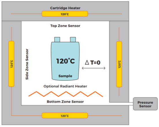 An Accelerated Rate Calorimeter (ARC) is an established method for determining the trigger temperature under adiabatic conditions. A cell is placed inside a reaction chamber (see Figure 5). Once the chamber is closed, a heat-wait-seek (HWS) cycle is started. The system heats up by a small temperature increment, then switches to waiting for a defined time for thermal equilibrium - followed by a seek mode evaluating the temperature increase rate. If a predefined temperature rise is exceeded, then the ARC switches into an Exotherm Mode. Then the ARC provides an adiabatic environment, in which released energy can be measured by temperature increase. If the predefined temperature rise is not exceeded, a new HWS cycle is started. For the experiments, an EV+ ARC manufactured by Thermal Hazard Technology is used. A schematic of the used temperature sensor placement and a view inside of the ARC can be seen in Figure 6.