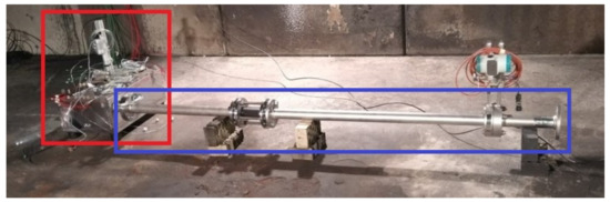 Overview of the test facility: the mini-module test bench (red box) is connected via flanges to the exhaust system with a massflow meter (blue box), which allows the generated venting gas to vent into the surrounding environment.