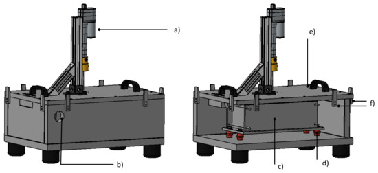 CAD rendering of test bench. Left: closed test bench. Right: Placement of cell mount within the test chamber. The following components are visible: (a) Hydraulic system for nail penetration (b) Exit for exhaust line (c) Cell mount (d) Low heat conduction post insulators (e) Removable lid (f) Clamping system.