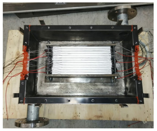 A multi pouch cell setup consisting of up to 12 of the chosen pouch cells can be placed inside the cell mount. In between the cells and between cells and cell mount, aluminium sheets with cutouts for temperature sensors of Type K are used. The thickness of the sheets are equal to the width of the sensors at 1 mm. A picture taken during the assembly of the multi pouch cell setup can be seen in Figure 10. By using these sheets, through-plane heat conduction from cell to cell can be studied and the temperature sensors are not indenting into the cells. The sheets surrounding cell 4 (counted from the exhaust pipe)—nicknamed the “super sensor cell”—is equipped with more temperature sensors to analyze in-plane (lateral) heat conduction; the sheet between cells 4 and 5 is shown in Figure 10.