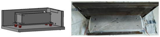 The cell mount is connected to the steel case using low heat conductivity post insulators, reducing heat transfer between the mount and case. The mounting arrangement allows for movement, to trigger different cells. The initial thermal runaway was triggered in cell number 7 (see Figure 12)—one of the two middle cells, causing a thermal propagation in both directions through the cell stack. Two identical cell mounts were manufactured and can be used interchangeably. The placement of the cell mount inside the test bench can be seen schematically in Figure 8 and before testing in Figure 9.