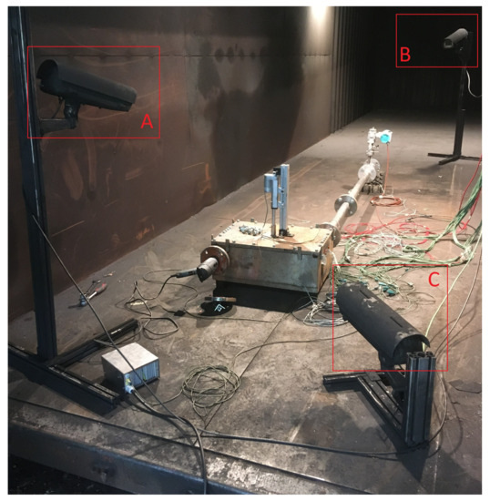 The surrounding environment is a retrofitted shipping container, into which the venting gas is emitted from the test bench. The air volume of the shipping container has its own filter system, which runs during the tests. For first experiments, a larger experiment hall was used. In the surrounding environment, two cameras are placed to observe the setup, as seen in Figure 11. Camera A records the mini-module test bench to detect possible gas leakage and time of entry of the nail into the test bench, whereas camera B focuses on the gas exhaust. Camera C was used initially to capture another angle of the test bench, but was later omitted due to the redundancy to camera A.
