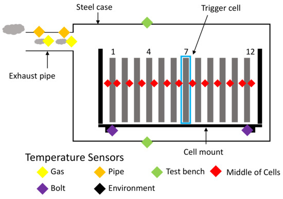 Type K thermocouples are used to measure the temperatures during the experiment, an overview of the placements can be seen in Figure 12. Most are placed in between the cells—to avoid indentation, aluminum sheets with cutouts for the thermocouples are used. The surface temperature of the test chamber is measured with two sensors on the outside—one at the top near the opening for the nail and one at the bottom centrally located. The exhaust gas is measured with sensors inside the exhaust system as well as sensors on the outside of the pipes, allowing for the calculation of heat transfer from venting gas to the pipe. Within the test bench, sensors are placed on the low heat conduction post insulators, which connect the cell mount to the test bench.