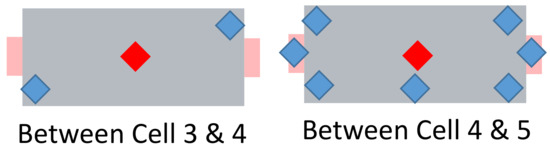 Schematic view of the nicknamed “super sensor cell”. Red: two centrally located temperature sensors (see Figure 12). Blue: additionally placed sensors.