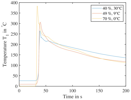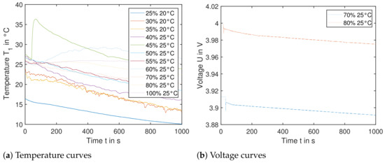 Figure 14a shows the resulting temperature curves of sensor , when the nail triggers the cell orthogonal to the electrode layers. Temperature sensor shows comparable results. The SoC ranges from to . Most curves show a declining temperature over the 1000 s recorded. This is due to the fact, that the experiments were carried out between March and June and the surrounding environment (shipping container) was not tempered. This leads to a significant cooling effect of cells with an SoC of up to . Cells with higher SoC were tested in warmer temperatures, so the temperature difference was less and the cells did not cool down as much. This also explains the initial temperature difference of the experiments—as the cells need to be clamped down as seen in Figure 3, the testing plate was at cooler ambient temperatures. Especially for the first test run with , the setup took longer than initially expected. In the following tests, higher initial temperatures were achieved due to an established setup routine.
