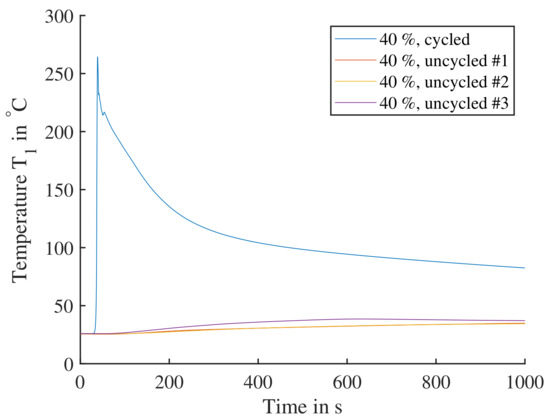 To recreate the battery conditions causing the TP reaction, a full charge and discharge cycle was added to the test procedure before the cell then was charged to the required SoC. In Figure 16, the cell reactions of 40% SoC with and without cycle are shown. The uncycled experiments lead to a slow temperature increase to surface temperatures of less than . For the cell with a previous cycle a rapid increase to a surface temperature of is seen. Cells tested at didn’t produce temperatures higher than , so is the lowest SoC used going forward regarding triggering a TP.