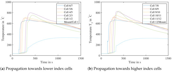 Test bench validation with air, cell number 7 triggered by nail penetration. The cell pack was tested at an initial setup of SoC at . (Left): Propagation towards cells with lower index—Temperature sensor between cell 3 and 4 missing. (Right): Propagation towards cells with higher index.