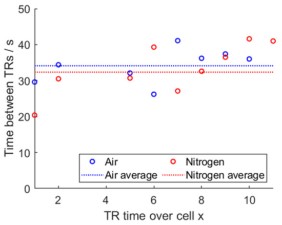 This shows that tests using air or nitrogen are both yielding results, in which the deviations of the time until the next cell undergoes TR in comparison to the mean value of all times is not of statistical importance. Similar average propagation times hint to a high degree of repeatability between both experiments.