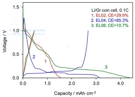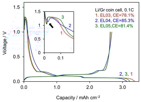 Voltage profile of the first cycle at 0.1 C of Li/Gr coin cells. (1) EL02, (2) EL04, and (3) EL06.