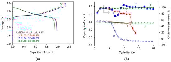(a) Voltage profile of the first cycle and (b) capacity and Coulombic efficiency of Li/NCM811 coin cells. (1) EL02, (2) EL04, and (3) EL06, in which the cell was cycled at 0.1 C between 2.8 V and 4.3 V.
