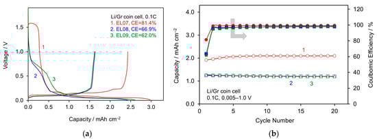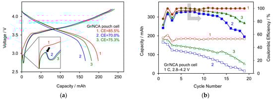 (a) Voltage profile of the first cycle at 0.1 C of Gr/NCA pouch cells and (b) capacity and Coulombic efficiency of the pouch cells at 0.1 C for the initial two cycles and at 1 C for the rest cycles. (1) EL01, (2) EL03, and (3) EL05.