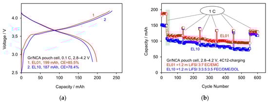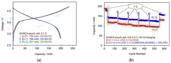 Comparison of two Gr/NCA pouch cells using EL01 and EL10. (a) Voltage profile of the first cycle at 0.1 C and (b) cycling performance by 4C12 fast charge and 1 C discharge.
