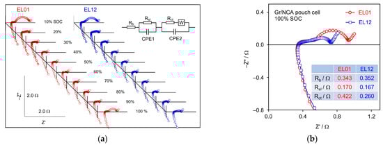 AC impedance spectroscopy of two Gr/NCA pouch cells with EL01 and EL12. (a) Overview at selected SOCs and (b) comparison at 100% SOC.