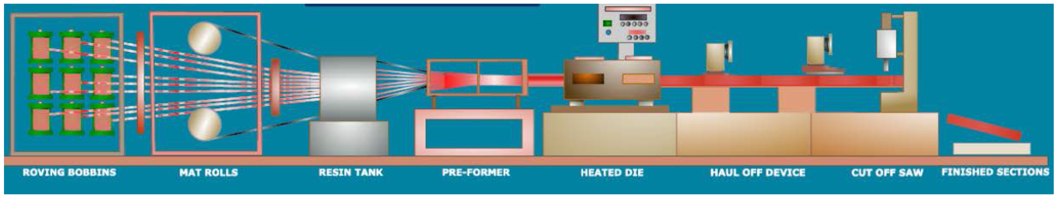 In the pultrusion process implemented in the company (ALTO), dry glass reinforcing fibers are pulled through a thermoset polyester resin bath for impregnation, and after the wetting process, the reinforcement is allowed to enter into a heated forming die where it attains the cross-section shape of the die and cures. Finally, outside the die, the composite profile already consolidated is pulled by a continuous pulling system and then a cut-off saw cuts the profile at a desired length. A schematic representation of the pultrusion process is presented in Figure 2.