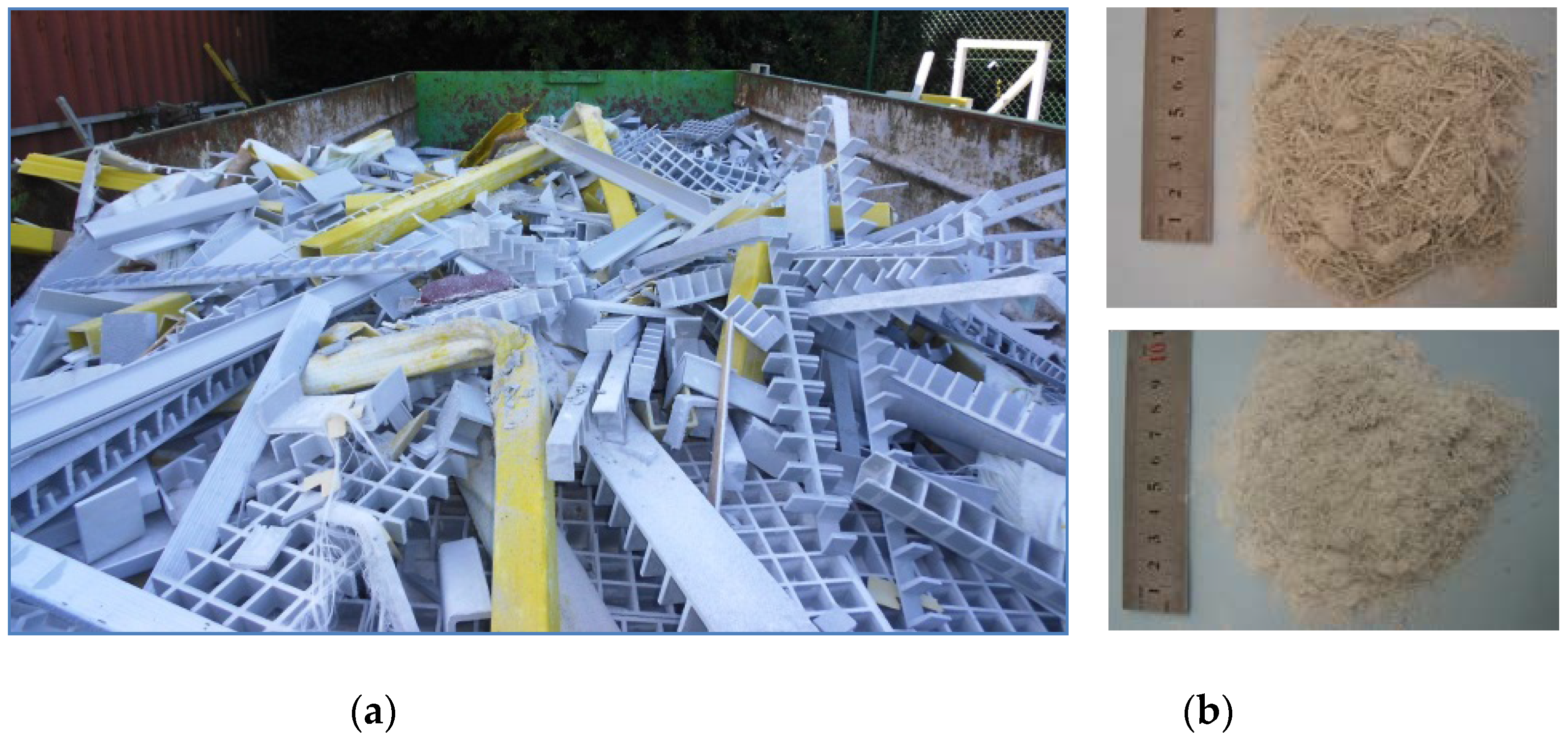 - Ribeiro, M.C.S.; Meira-Castro, A.C.; Silva, F.G.; Santos, J.; Meixedo, J.P.; Fiúza, A.; Dinis, M.L.; Alvim, M.R. Re-use assessment of thermoset composite waste as aggregate and filler replacement for concrete-polymer composite materials: A case study regarding GFRP pultrusion waste. Resour. Conserv. Recycl. 2015, 104, 417–426. [Google Scholar] [CrossRef]
