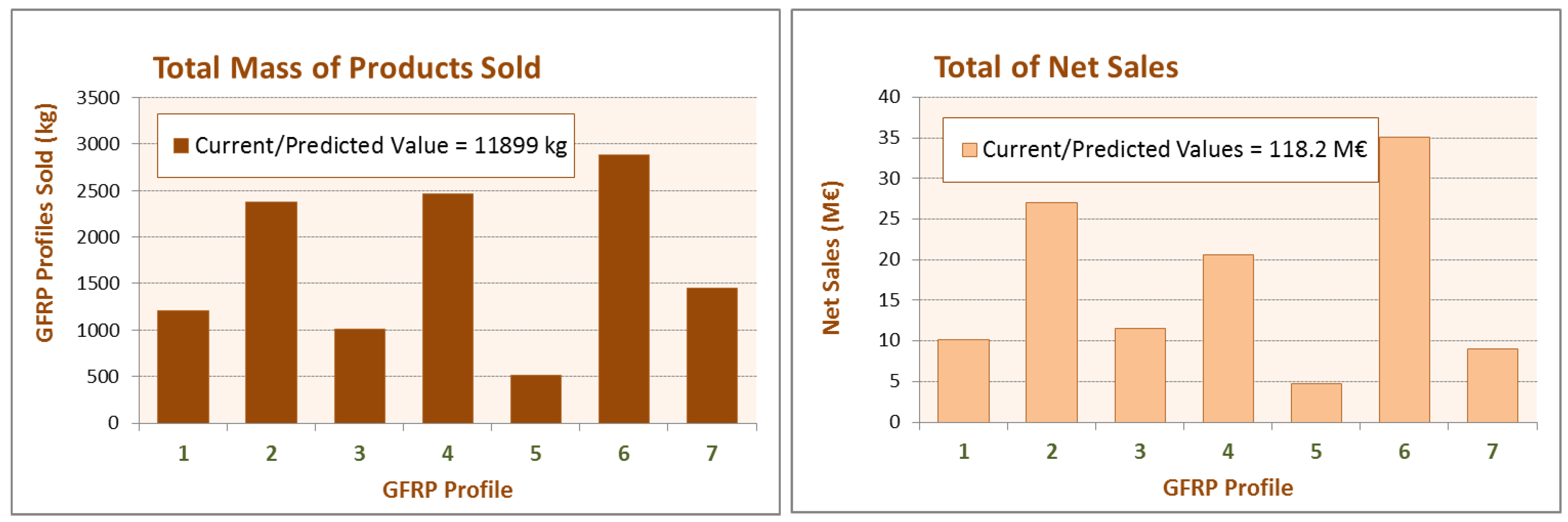 The obtained value indicators are presented in Figure 4, whereas the measured and predicted environmental indicators are depicted in Figure 5. Presented values are discriminated according to the seven types of pultrusion profiles produced during the framework time. They include four Generally Applicable Indicators of product value and environmental influence indicated in Table 2 and one Business Specific Indicator of environmental influence (total of production waste to landfill).