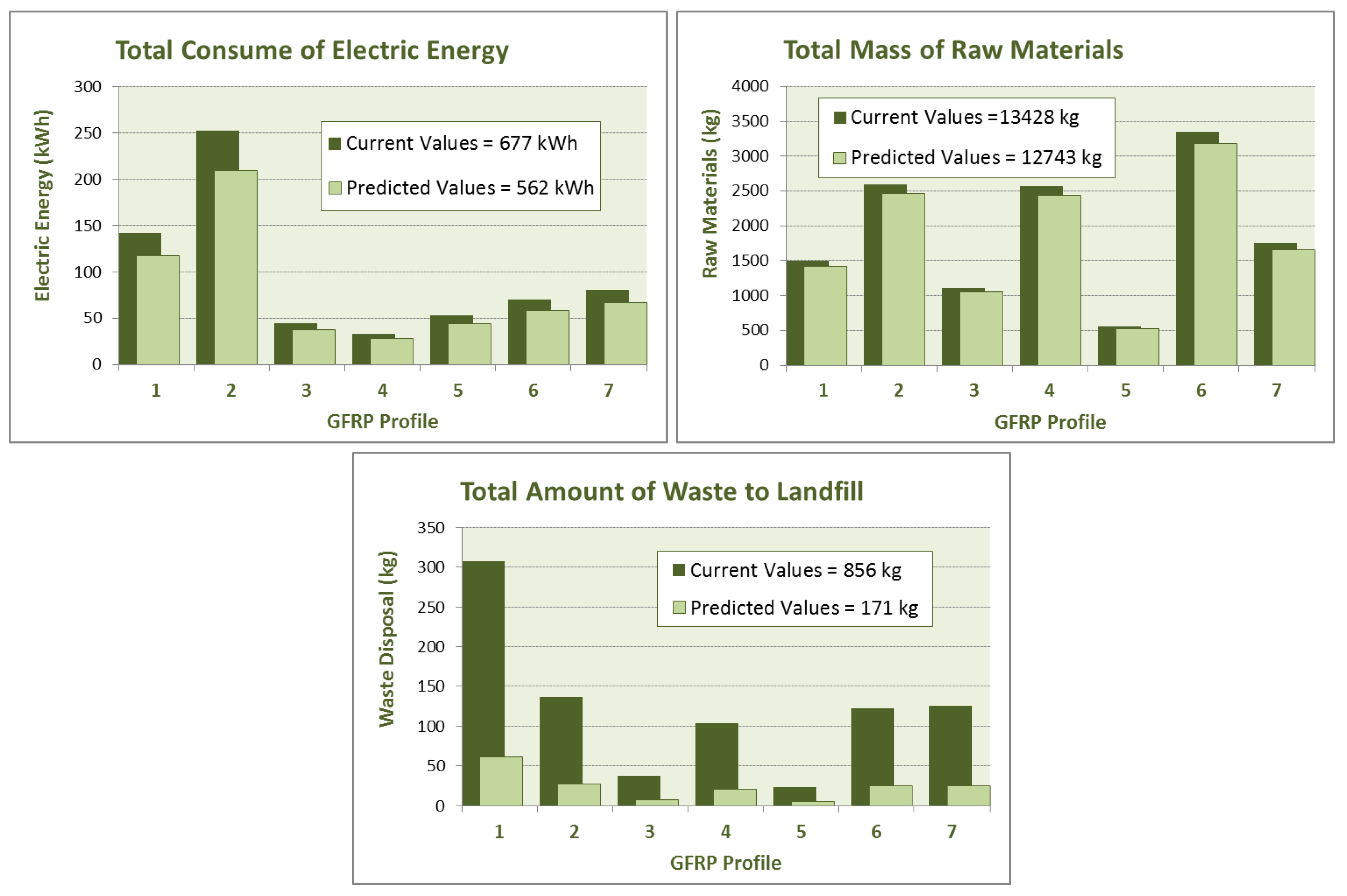 The implementation of a new die heating system and, especially, mechanical recycling approach, with partial waste reuse of scrap material derived from manufacturing, cutting and assembly processes of GFRP profiles, lead to both minimization of waste disposal and cost reduction on raw materials, electric energy and landfill process. These features lead to significant improvements in the subsequent assessed eco-efficiency ratios of the present composite materials’ industry, yielding to a more sustainable product and manufacturing process of pultruded GFRP profiles.
