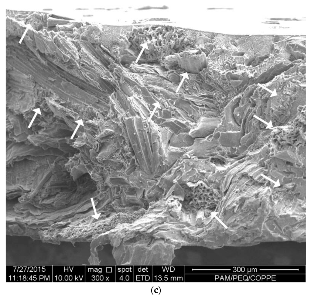 The SEM images of the composites (Figure 1) showed a fine dispersion between polymer and filler. We saw the same good dispersion between HDPE and SCB in a former work [17]; we ascribed it to the very fine fibres—which passed through the #100 mesh sieve—equivalent to 55% of the total SCB used in the composites. The images showed that most of the SCB particles were fractured instead of pulled (Figure 2). This can be taken as an indication of good adhesion between the materials. We believe that the presence of lignin in the SCB acted as coupling agent between polymer and filler [23,24]. Considering that we did not use any delignification process (NaOh, H2SO4) or compatibilizing agent—as is usual in natural fibre reinforced composites (NFRC) literature—the interface resulted adequately for the intended purpose. The SEM images on Figure 1 and Figure 2 show broken fibres in the cryogenically fractured section, denoting a strong polymer/filler interaction. The increase in the filler content tends to decrease the adhesion—shown by some voids in the polymeric matrix in Figure 1c. Most of them were caused by pulled fibres that were positioned parallel to the fracture section. As the intended application is compressive stress, this pulling effect on the SCB fibres will not be a problem.