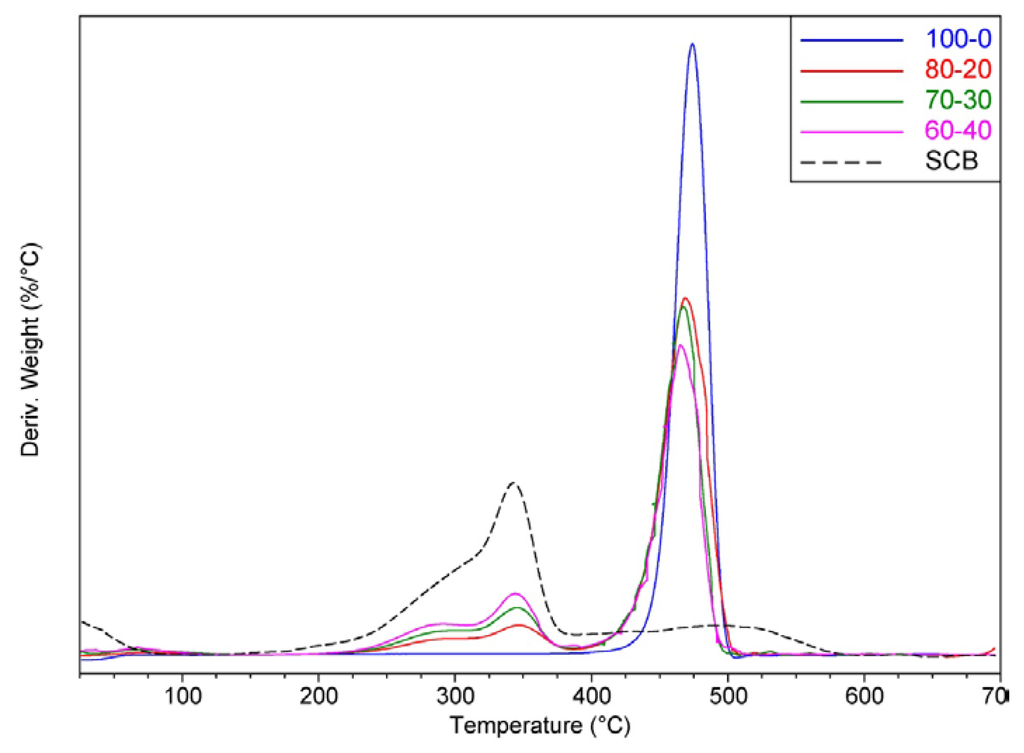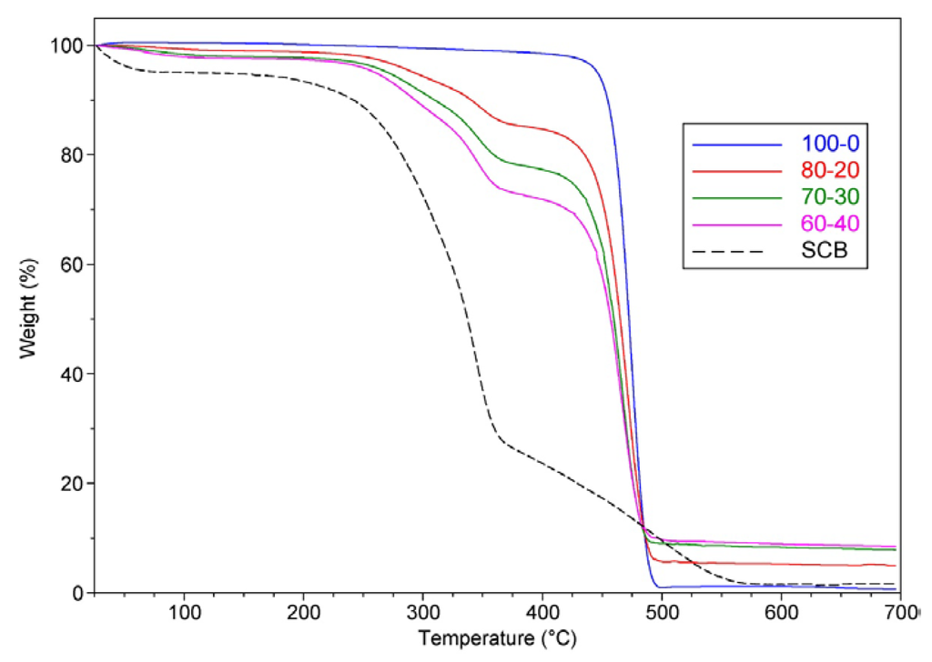 Figure 3 and Figure 4 and Table 1 show the Tonset, Tfinal, Tmax and the residue content of the composites. As expected, the 100–0 composite showed single-step degradation, leaving 1% residue. The rest of the materials showed three different steps of mass loss due to the presence of SCB, as seen in a former work [17]. According to literature, the composition of sugarcane bagasse is mainly cellulose (50%), hemicellulose (25%) and lignin (25%) [25,26]. The first step of mass loss—until 295 °C—was ascribed to the hemicellulose present in the fibres. The second step (295–380 °C) was probably linked to cellulose mass loss. In addition, the third step was ascribed to the degradation of lignin; this last step caused a slight decrease (2%) in the Tonset of the rHDPE. These steps were better seen through the changes in the DTG curves, where the Tmax peaks usually show up. The first one was noticed by a slight “shoulder”—around 290 °C—which became more well defined as the filler content increased; the second one was around 347 °C, and also became sharper with more SCB in the composite. Despite the general decrease in the Tonset of the neat rHDPE, the materials started to lose mass after the average processing temperature of HDPE (around 200 °C).