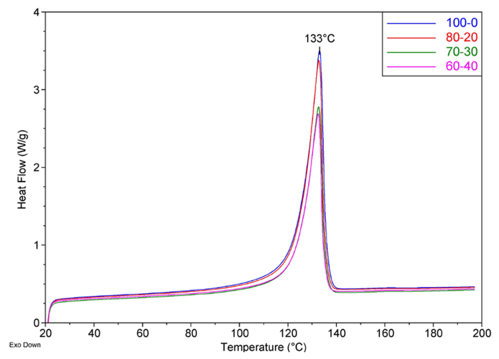 Differential Scanning Calorimetry curves of the 100–0 (a), 80–20 (b), 70–30 (c), and 60–40 (d) composites.