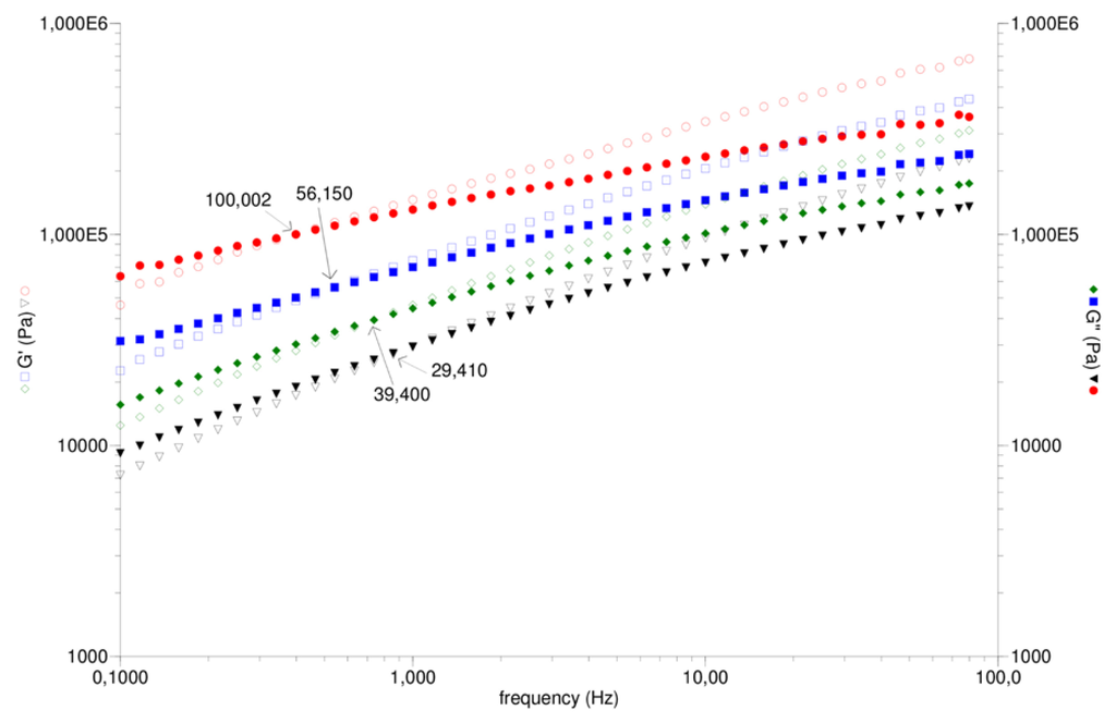The rheological measurements were performed in the molten state, in a parallel plate rheometer (diameter 25 mm, gap 1 mm) TA Instruments, model AR 2000, in oscillatory shear mode (200 °C, N2 atmosphere). Tests of deformation variation were made to obtain the linear viscoelastic region, at the angular frequency (ω) of 6.28 rad·s−1. The storage (G′) and loss (G′′) moduli and the complex viscosity (η*) were determined considering the linear viscoelastic region of the material, in the frequency range between 0.6 and 500 rad·s−1.
