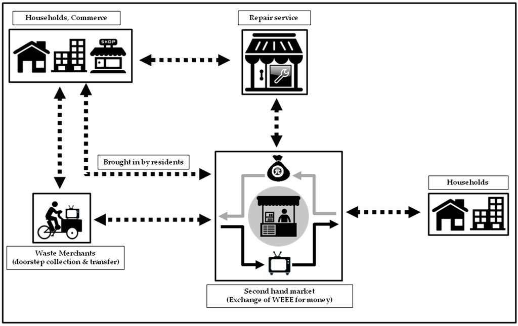 Given this strong control of the informal sector over WEEE collection and repair segments, the question is how informal institutional structures operate and why they perform better than the formal sector. Firstly, informal collection is driven by high revenues, which the actors involved initially provide so as to pay the relatively high compensation to households for their WEEE (see Section 3.1.2). Formal collection is incapable of competing with these reimbursements and, as such, formal systems operate on a high-cost basis due to the comparatively high expenditures for labour and transport mandated by state regulations [59]. Once informal actors have gathered a sufficient amount of WEEE, they either transfer it to recycling or to secondhand markets for reuse. Previous research has shown that informal collectors and even informal recyclers transfer EOL devices or components into reuse as long as these products possess a certain degree of functionality or are in a repairable condition—the decisive reason being that the functional value of old devices is much higher than the value that can be reaped from material recovery [12,15,60].