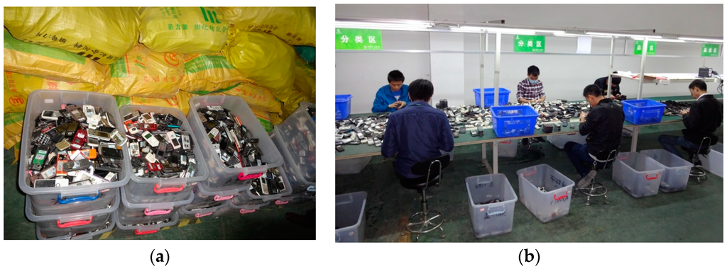 A similar system is adopted by the largest provider of refurbished mobile phones, Taolü Huanbao (Clean Green Environmental Protection), which has also used the Internet to develop its business. Established in 2009, the company relies on online structures to buy mobile phones from individual users and collecting parties at prices determined by the company based on the age and type of the device. In addition to working with individual users, the company has contracted over 1000 mobile phone take-back operators in over 80 cities in China, some of whom offer doorstep collection services [67]. This approach shows some similarities to the effective schemes of informal actors. As a matter of fact, Taolü Huanbao indirectly makes use of informal collection systems, as it does not discriminate between formal and informal supply channels. In interviews with the author it was indicated that anyone who sets up an online account with the company may supply Taolü with discarded mobile phones. The online exchange starts with suppliers transferring the devices first; upon receiving the products Taolü verifies the brand, age, and category before making an offer. In order to explain how they convince wholesale suppliers to transfer devices before receiving payment, Taolü’s CEO Manson Loo refers to the company’s transparent online information service, which has been designed so as to foster reliability between the sellers, the company, and the buyers. This trust-generating mechanism does, in turn, provide an alternative to informal, less transparent collection systems. A look inside the company’s headquarters shows a refined organisation of device pre-processing (cleaning, sorting, and separation) for reuse (see Figure 5). Every batch of mobile phones entering the company is first scanned, photographed, and then documented regarding the quality, size, weight, and number of devices. This information is then stored in the company’s database and the seller is supplied with documentation that attests to it. In the second step, every device is manually scanned and categorised according to product generation, screen size, functionality, battery type, and product age. Based on this categorisation, Taolü Huanbao makes an offer to the seller, and if the offer is accepted, they either conduct refurbishments within the company or transfer the mobile phones via wholesale markets to buying parties, e.g., secondhand markets. These internal measures for estimating the device value resemble a refined, more detailed method of what is practiced by the informal sector. A look at the figures shows that this “fundamentally market-oriented” and information-intensive model reaps economic success. Up until 2013, 8.7 million phones were transacted from sellers over Taolü Huanbao to buyers, and in 2014 this number grew to 14 million, equating to a 61% increase in transacted mobile phones. Echoing the core concept of Ai Huishou, Taolü Huanbao calculates the reuse and refurbishment of mobile phones to be significantly more profitable than selling the devices to formal recyclers [69]. This again follows the same logic that informal actors in WEEE management employ: The gain from reuse is higher than the gain from material extraction.