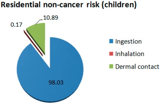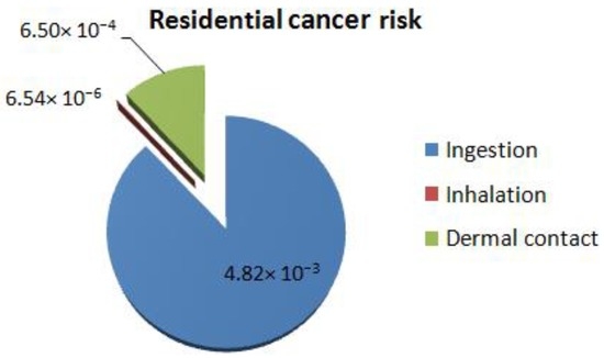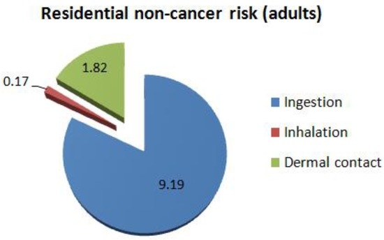 Ingestion is the most critical pathway, followed by dermal contact (Figure 1, Figure 2 and Figure 3). Non-cancer inhalation risk is below the threshold, whereas the cancer risk posed to residents via inhalation is considered acceptable, since it is based on conservative assumptions.