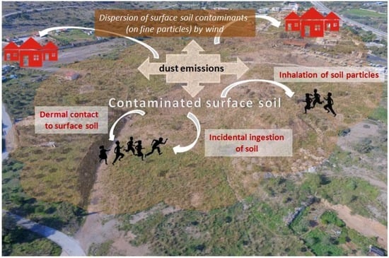 Since there are no volatile chemicals in the soil and the risk caused by inhaling soil particulates is relatively low, inhalation exposure is of no particular concern. Still, the airborne fine particles of contaminated topsoil can disperse by wind in a larger area and migrate to indoor dust. Moreover, given that mine waste at Kavodokanos site has low mobility and groundwater is not used for drinking or other domestic purposes, no risks are posed to receptors via this pathway. All in all, with regard to the current and future land use of the site, concerns are expected to rise only from contaminated topsoil, mainly through incidental ingestion or dermal contact.