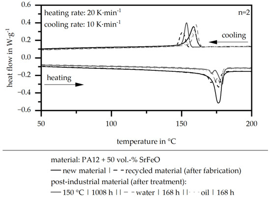 Route of the DSC measurement relative to the treatment conditions and the amount of recycled material [matrix: PA12 | filler: SrFeO | filler grade: 50 vol.-%].