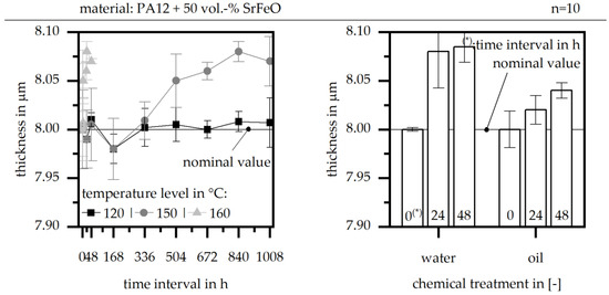 Impact of the time interval in terms of the temperature treatment (left) and chemical treatment (right) on the thickness of the samples [matrix: PA12 | filler: SrFeO | filler grade: 50 vol.-%].