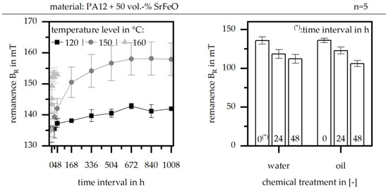 Similar to the change in the thickness, Figure 3 shows the impact of the different temperature levels and time intervals (left) as well as the chemical treatment (right) on the remanence BR. In terms of the temperature treatment, the remanence BR increases with longer time intervals, which was not expected. The temperature levels were chosen in terms of a rapid aging, and the time intervals should be stopped within reaching half of the initial value of BR. However, it can be clearly seen that BR increases with longer time intervals, especially in terms of the temperature level of 150 and 160 °C, even though the standard deviation is high. It can be assumed that the higher temperature allows molecular movement to some extent, with which the oriented fillers affect unoriented ones within a certain perimeter. Therefore, the amount of oriented fillers can be increased, which leads to higher magnetic properties. In terms of the chemical treatment, the remanence BR is reduced during the interaction with the media and with increasing time. This goes along with a reaction between the filler and the chemicals that could lead to oxidation or a change in the polymer structure due to the chemical treatment.