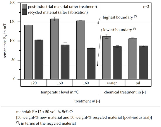 Figure 4 compares the magnetic properties by the value of the remanence BR in terms of the post-industrial material (after the treatment) and the recycled material (after the fabrication). Further, the highest and lowest boundary of the possible remanence BR in terms of the recycled material is shown. The filler SrFeO of the type OP-71 has an initial BR of 439 mT. If the fillers in the post-industrial material (with 50 vol.-% filler grade) are fully oriented, theoretically, the remanence BR can reach a value of 219.5 mT. Within the recycled material, the total filler grade is again 50 vol.-%, which means that the ideal BR is 219.5 mT. However, if the reduction in magnetic properties through the treatment is taken into account, the ideal value reaches only 294.5 mT. If all fillers within the recycled material are oriented, the highest possible magnetic property is 147.25 mT. If only the new material within the recycled samples would contribute to the magnetic properties, the middle boundary is reached with a value of 73.63 mT. If none of the filler material is oriented, the lowest boundary is arrived at with the value of 36.8 mT. Taking into account that already within the fabrication of the post-industrial material only 70% of the ideal value of BR is reached, the magnetic properties within the recycled material must be partly realized by the post-industrial material and not only by the new material. Nevertheless, the remanence BR is reduced in terms of the pre-treatment within the post-industrial material. Relative to the conditions of the treatment, the dimension of the reduction varies between 50 and 70% in terms of the ideal value. However, authors have interpreted this reduction to be within an adequate range to reuse post-industrial materials within the magnetic context. The magnetic properties of virgin material (without any treatment) reach 100 mT, and it is therefore comparable to recycled materials within these investigations.