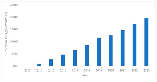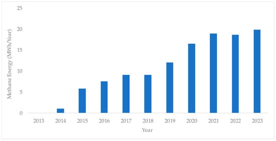 where LHVCH4 is the lower heated amount of CH4 and is given as 37.2 MJ/m3, QCH4 is the amount of methane produced each year in mg/year, 3.6 is the conversion factor from MJ to kWh, λ is the collection output of 60% [57], and η is the electrical output for the internal ignition engine, given as 33% [44].