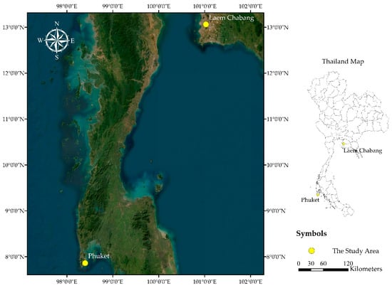 The municipal solid waste (MSW) generation system in Thailand is increasing every year, especially in urban areas such as the Bangkok Metropolitan Region [8]. This study used the MSW characteristics of selected urban cities in Thailand, specifically Laem Chabang in Chonburi Province and Phuket City in Phuket Province, as shown in Figure 5. Table 5 provides the sorting of the waste categories. Common MSW components include plastic bags, foam, paper, rubber, wood, grass, metal, glass, and food waste. Incineration or the use of landfill gas can be implemented in the municipal solid waste system in Phuket and Chonburi. It possesses the capacity to handle substantial amounts of waste. The wet mass basis of MSW revealed average moisture content of approximately 55%. According to reports [9,10,36], Phuket’s waste quantity approximated 5 kg/capita/day. In Scenario 1, Phuket City in Phuket province operated a landfill with a useful life of 10 years, which began operations in 2013 and was projected to end in 2023. Phuket is located in the southern part of Thailand; it is an island city and tourism area. MSW was collected from the city and transported to the landfill site. Laem Chabang, in Chonburi Province, represented Scenario 2, where waste was disposed of in a landfill with a useful life of 10 years, operating from 2013 to 2023. The landfill was owned by the city municipality, while a private venture held the legal rights to use the biogas produced. This situation is typical of urban cities. This region is located in the east of Thailand, characterized by industrialization and urbanization. We characterized the weather and climate in the two study areas. Phuket Province has mountains, large and small islands, and sandy beaches. It is warm in Phuket all year round, with temperatures ranging between 25 and 34 °C. Phuket typically has two different seasons, dry and wet, with transitional periods in between. The wet season starts in June and ends in October. This is Phuket’s low season. The mean precipitation in Phuket is approximately 2500 mm, predominantly occurring during this timeframe. The conditions are hot, humid, and moist [52]. Chonburi Province is primarily characterized by mountains, numerous large and small islands, and surrounding industries. The average temperature was recorded at 27.5 °C, with 1269 mm of rainfall. Chonburi Province has three clearly distinguished seasons (winter, rainy, and summer). However, the amount of MSW in Phuket and Chonburi is increasing annually, and, in order to reduce the waste and greenhouse gas emissions, there is a need to enhance the waste management capabilities. MSW is separated in two ways, with the first option being its transfer to the station for the thermochemical process and the second involving its collection and transfer to the biochemical process. The common flowchart for waste-to-energy technologies is shown in Figure 6 [53,54,55].