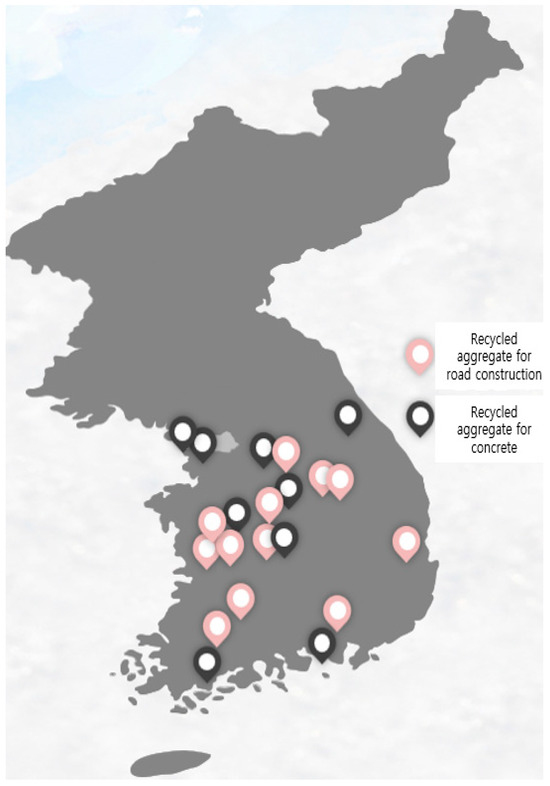 The waste concrete fine powder used in this experiment was collected from 20 intermediate treatment companies across South Korea. Based on the intended use of the aggregates, 12 samples were obtained from recycled aggregate production processes for road construction, and 8 samples were obtained from recycled aggregate production processes for concrete. The regional distribution of the recycled aggregates produced from waste concrete, categorized based on their intended use, is shown in Figure 2.