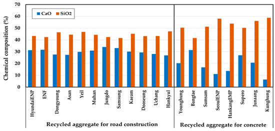 Figure 4 illustrates the chemical composition of waste concrete fine powder collected from final products at domestic intermediate treatment plants. The fine powder obtained from plants producing recycled aggregate for road construction exhibited the highest CaO content, approximately 28% to 31%. Conversely, the fine powder from plants producing concrete aggregate showed a lower CaO content, averaging 20%. This distinct difference in chemical composition indicates that the intended use of the aggregate significantly affects the composition of the fine powder. The relatively higher CaO content and lower SiO2 content in the fine powder from road construction aggregates suggest a higher cement paste residue, which remains during the recycling process. On the other hand, the more intense crushing and separation processes for concrete aggregate result in the removal of cement components, leaving behind primarily aggregate material.